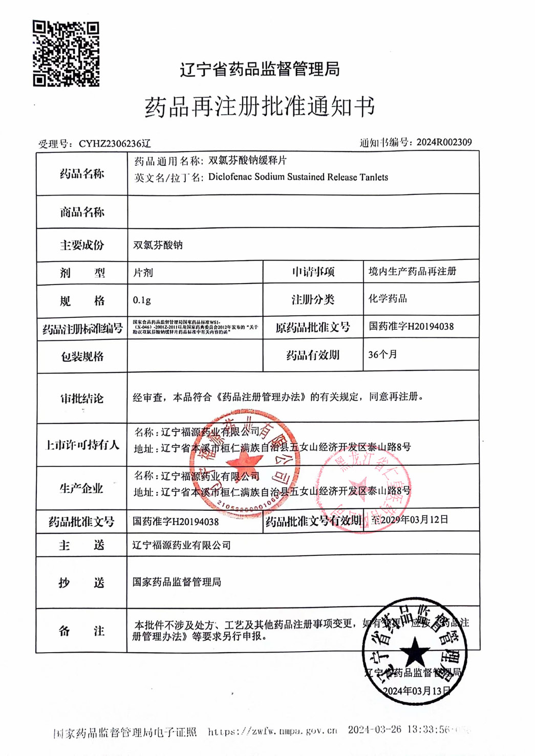 雙氯芬酸鈉緩釋片遼寧