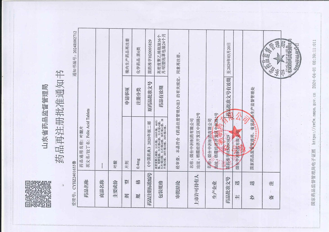 葉酸片煙臺中洲制藥有